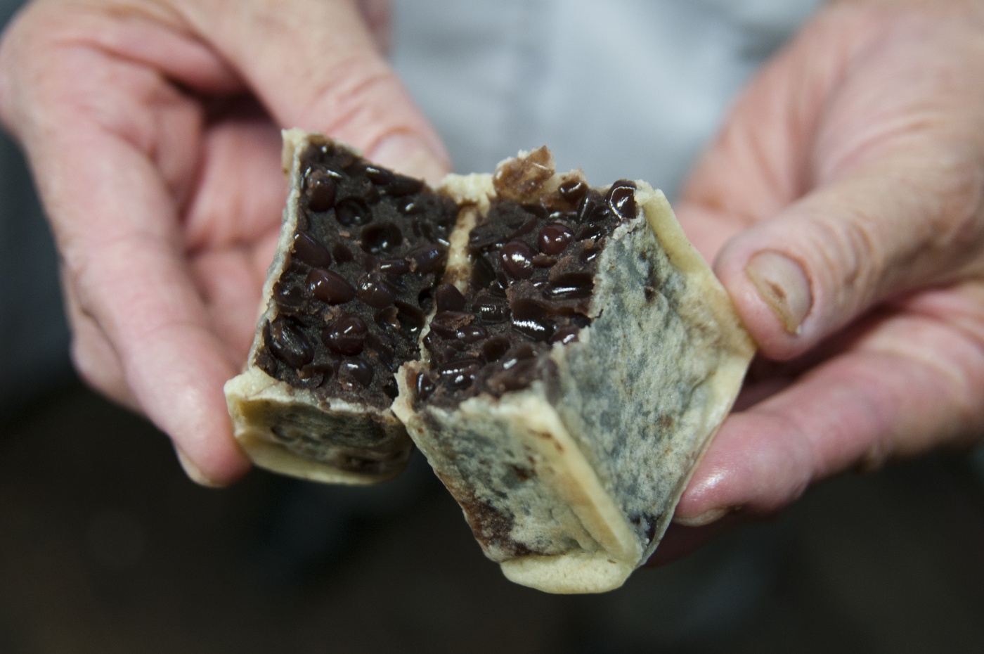 I broke one of the kintsuba in half in my hands and found shiny, glistening beans packed inside. The firm skin of the beans is proof that this bean paste is lovingly homemade fresh every day.