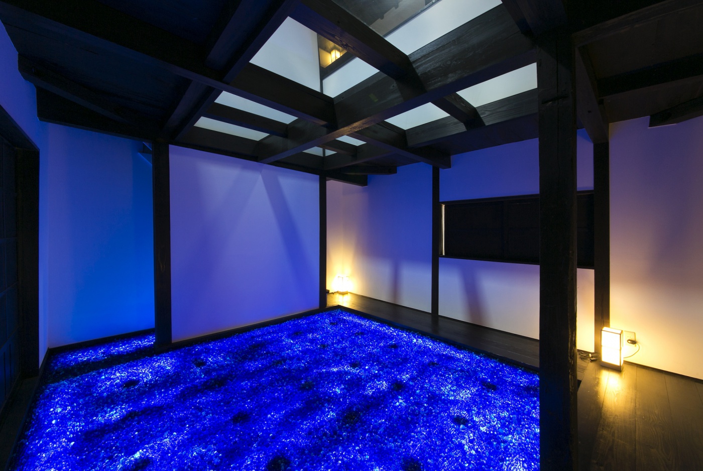I went up the stairs and found that the floor was made of glass and overlooked the blue lights. This, apparently, is where guests are meant to lay their futons and sleep. I wondered what sort of dreams the blue light shining on my back would bring.