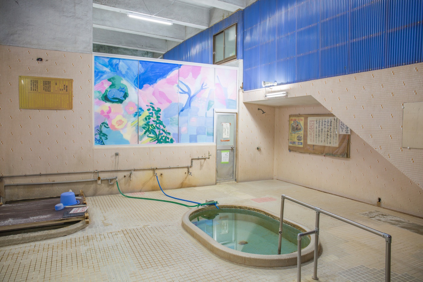I heard that there were several onsens in the neighborhood, but I decided to go to Higashimachi Onsen next to Higashi-Beppu Station because I had learned that there was a work of art inside. On the two-story concrete building was a sign that charmingly said “A quick bath before the train comes”. I paid the bath fee at the attendants booth, which looked like it had gone unchanged for ages, and stepped through the noren*.