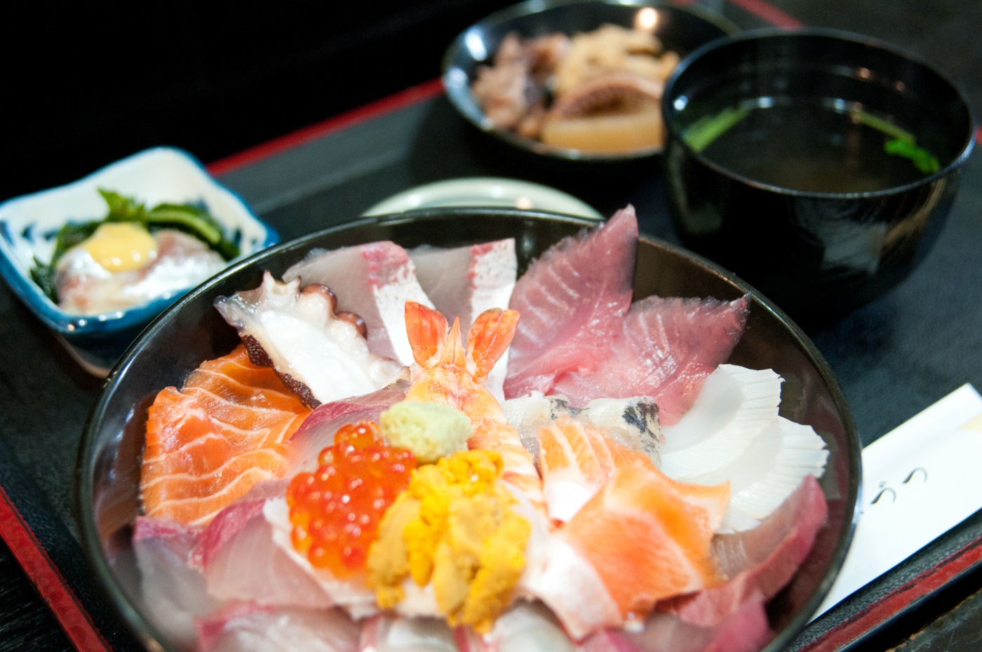 I took my place at the counter and ordered the recommended seafood bowl set. While I waited for my order to come out, I couldn’t take my eyes off of the chef as he silently prepared the fish. With mesmerizing skill and deft he worked, and like magic the fish became beautiful slices of sashimi.