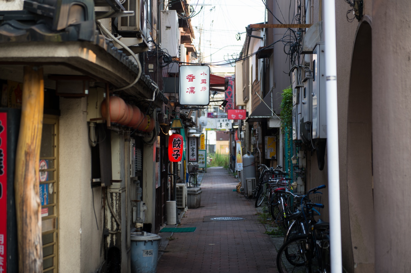 As the sun goes down in Beppu, the neon signs of the bar district begin to light up. From Shingu-dori I turned down a back alley so narrow that even a small car couldn’t pass, until I came upon a restaurant with a bright red paper lantern. I passed through the noren* which had the restaurant’s name, Shochubo Karin, written on it and was greeted warmly by the owner.