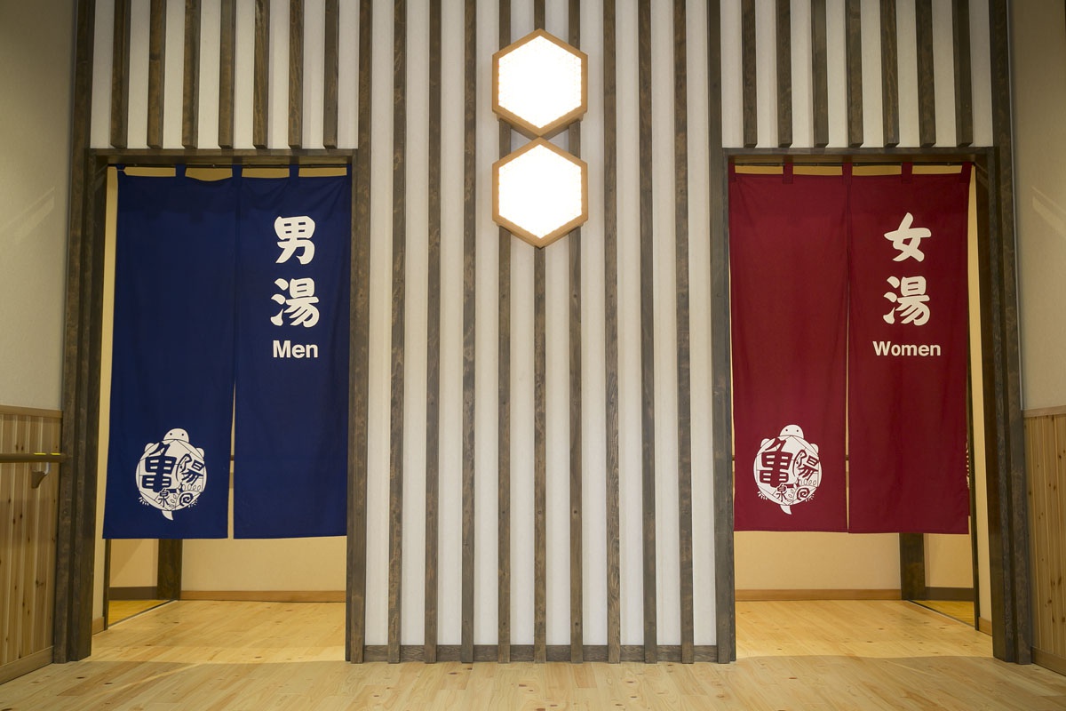 he recently completed building still has the faint smell of fresh cut wood. All throughout the interior you can find the tortoise shell motif appear in the window frames, the lights, and more. It’s fun to keep an eye out for appearances of the tortoise shell motif. I learned that the turtle illustration on the noren was actually drawn by a local middle school student. When you pay the bath fee the attendant will say, “Enjoy soaking in the bath and take your time,” as she ushers you inside.