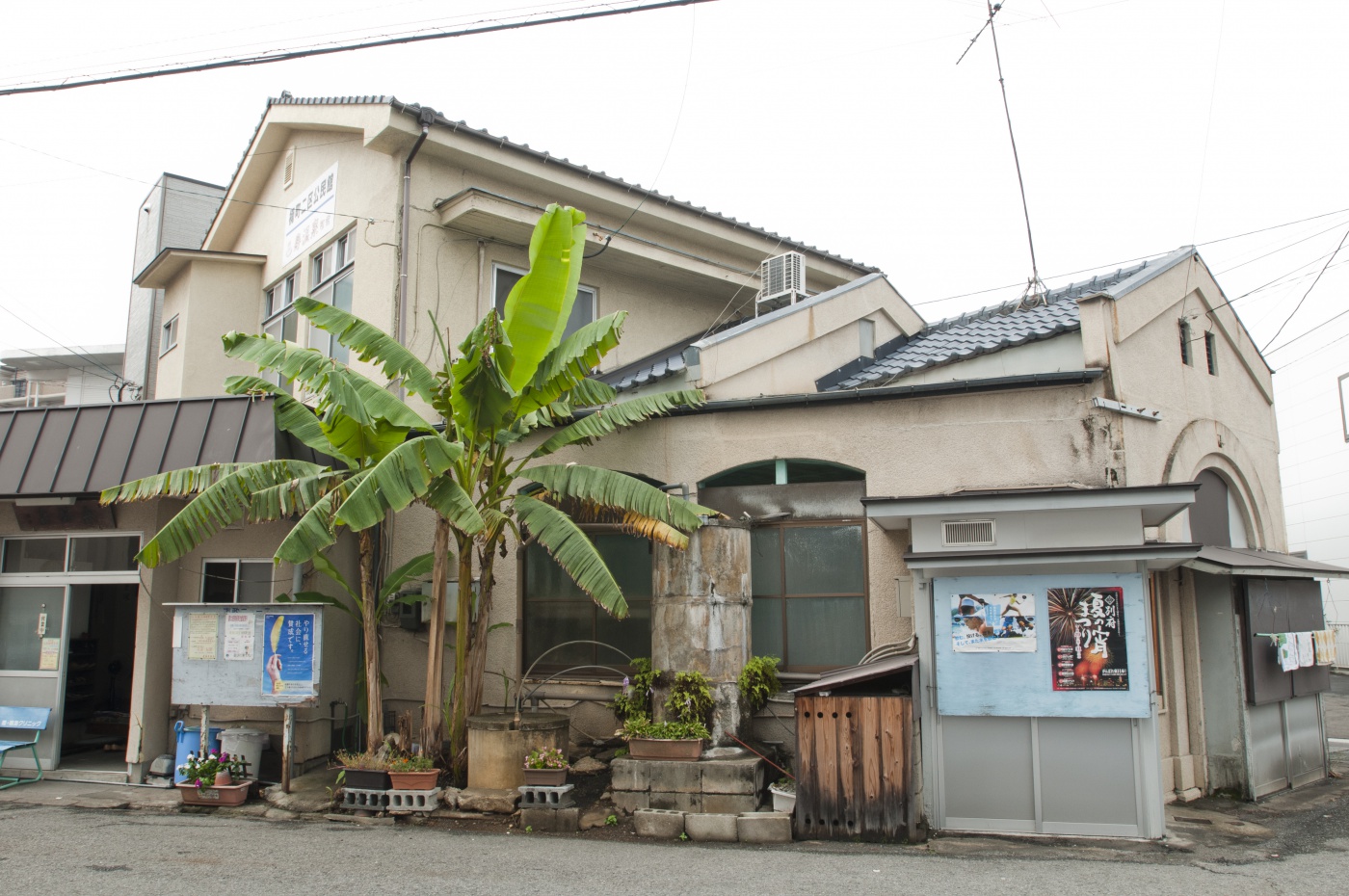 Emerging from a winding backstreet, I came upon a single banana tree standing in the middle of a three-way intersection. The tree belongs to a building with arched windows and a tiled roof — Kotobuki Onsen*.