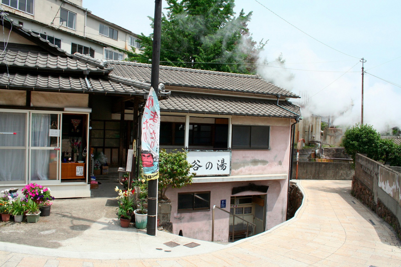 Tani no yu is one such local onsen. Here, customers pay the bath fee at the top of the stairs, and then descend to find the bathing area at the bottom — quite unusual for onsens. Having the dressing area directly beside the bath is a common layout found in Beppu onsens.