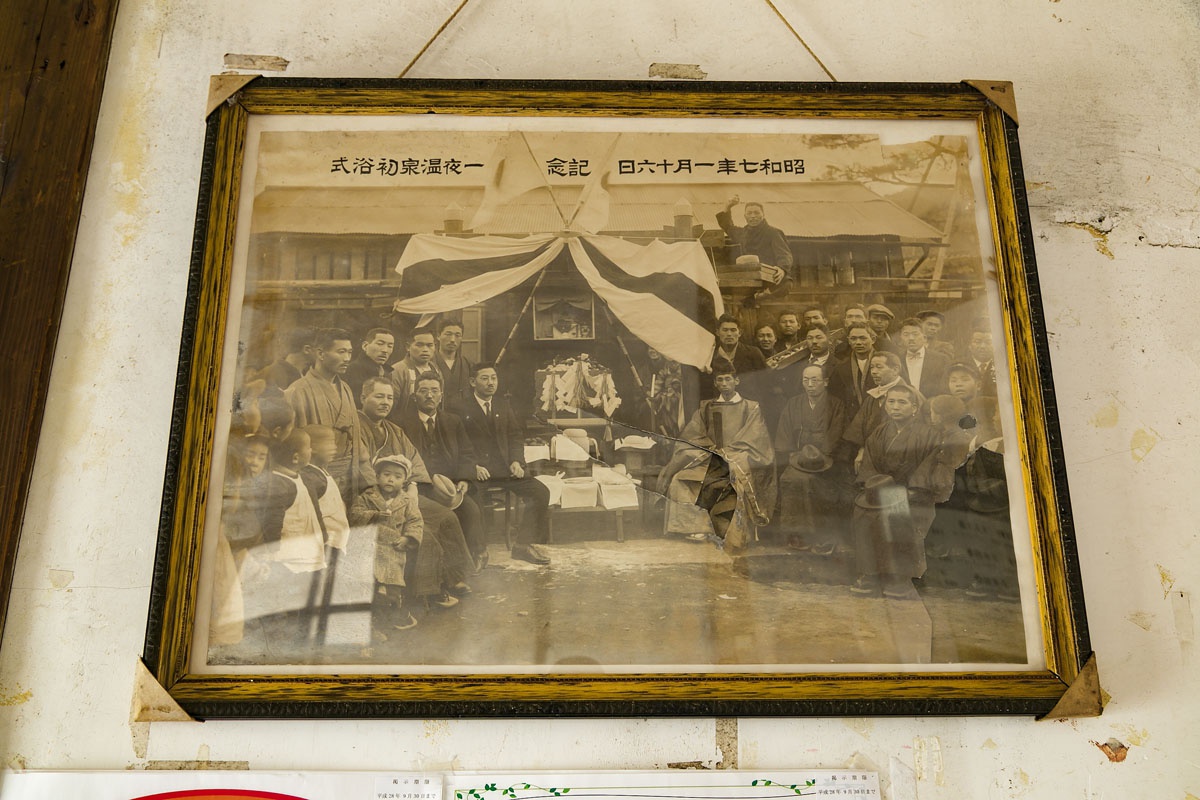 Apparently the name of this onsen has changed several times of the years. When the hot spring was first discovered by locals, they all carefully considered how it should be used. It is said that some local carpenters and craftsmen came together and built a wooden structure over the hot spring in one night, opening a small public bath. According to folklore, this led to it’s first name, Ichiya (one night) Onsen. Hung on the wall net to the reception desk was an old photo taken around the time the onsen was built — everyone is the picture has a look of pride.
