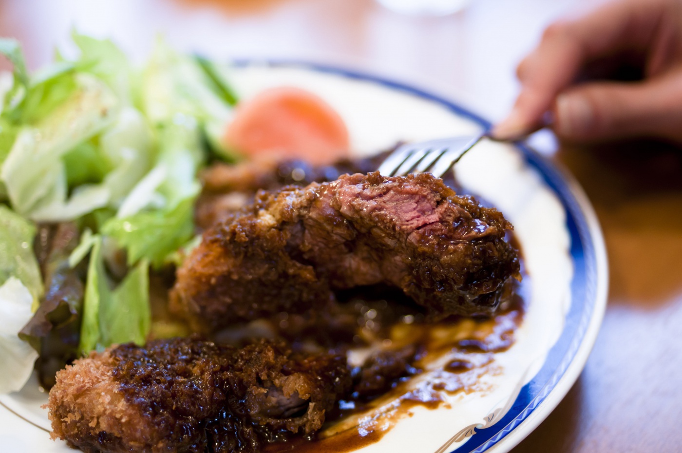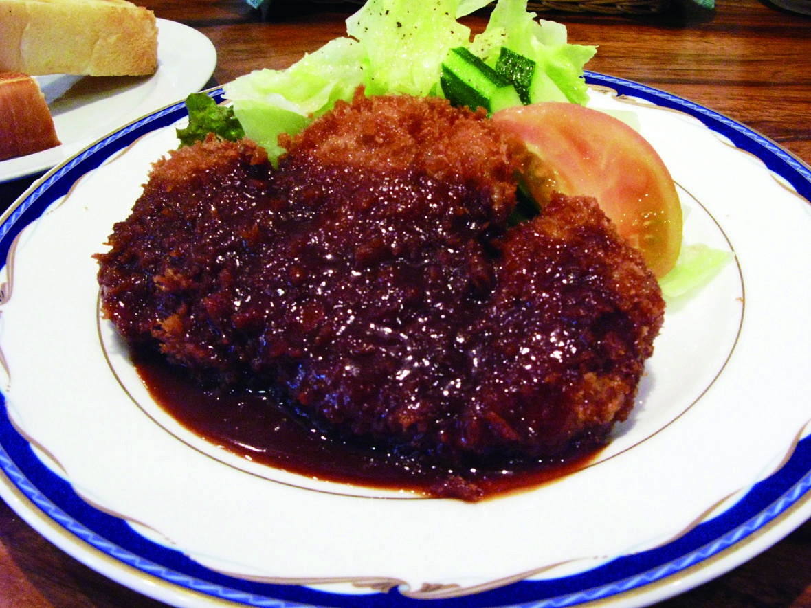 Watching the chef work is mesmerizing as he fries the golden brown beef cutlet and lightly coats it in a demi-glace sauce. I took one look at the menu and I knew right away what I wanted to get, but I actually really enjoy carefully looking over menus with western dishes and trying to decide what to get. The restaurant opened in 1953. At that time, many of their customers used to say that they prefer to eat western food on sunny days. Their eyes would sparkle as the chef went to work creating enticing dishes in the open-style kitchen. From the kitchen, the chef can see every customer, and he would kindly slice the beef cutlet into small pieces for customers who weren’t accustomed to using a fork and knife.