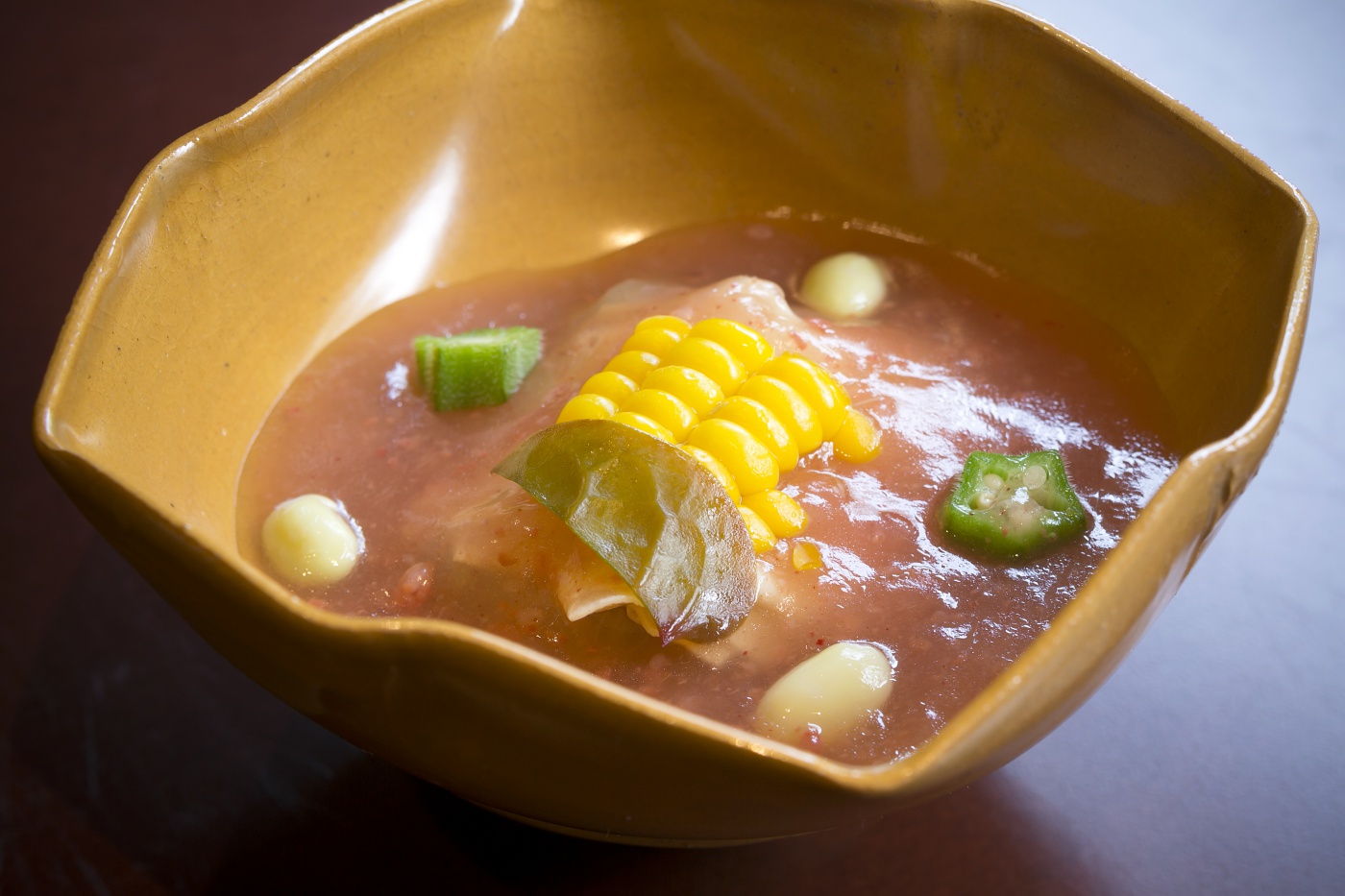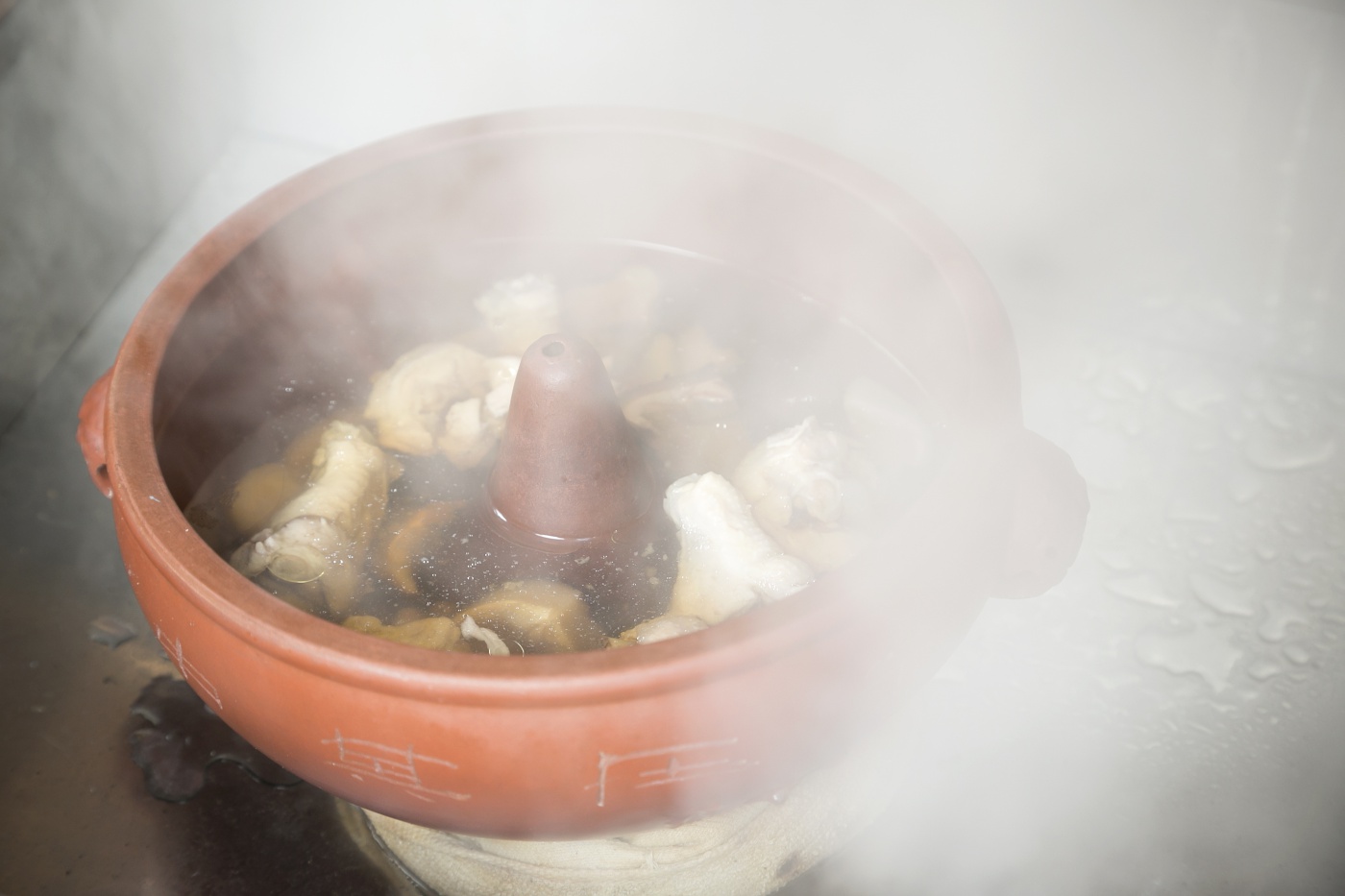 Lunch and dinner service at Mushicharo feature only course meals. One of the most important differentiating factors about this restaurant is the actual pot that is used for steaming. Most of the restaurants that serve geothermally steamed food in Beppu use containers made from stone, but here they use specially designed and manufactured pots made from stainless steel. “They are special pots that employ the concepts of steam engineering. The source of the steam in Kanawa is rich in silicic acid, which has a moisturizing effect. The pots we use have a special part attached to them that creates a silkier steam by subdividing the mineral-rich steam as it comes up from underground while also regulating the temperature.” Depending on the ingredient being cooked, the ideal temperature can range from 45 to 95 degrees Celsius. “65 for chicken, 42 for eel…” I listened as the chef recited the exact temperatures he uses to steam each individual ingredient. He seemed closer to a scientist than a chef. As we talked, he was preparing one of their most popular dishes, a soup that is made using only steam to draw out the natural flavors and moisture from the ingredients.