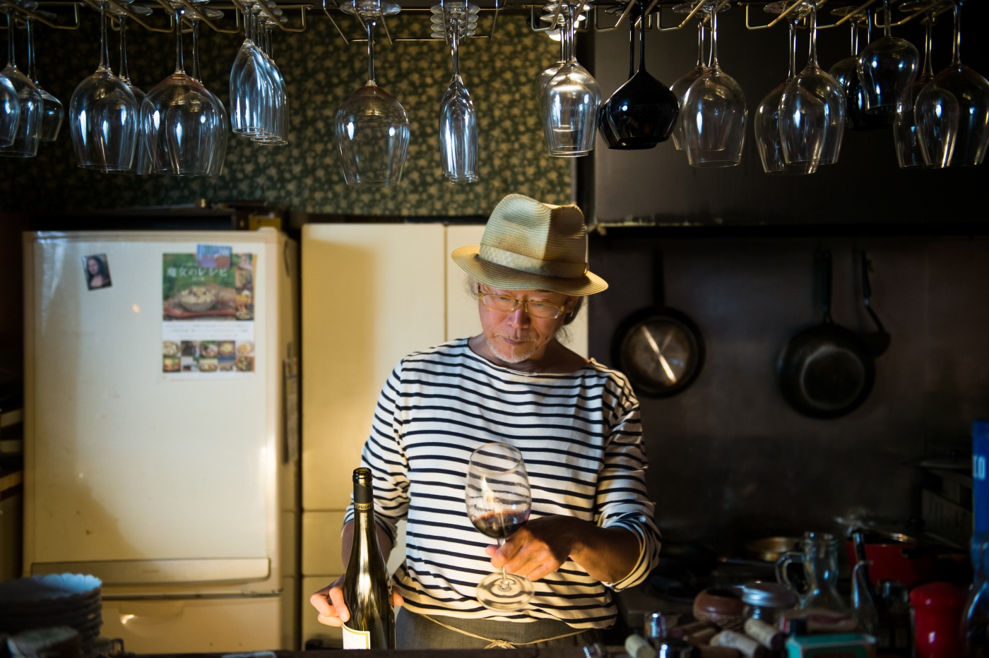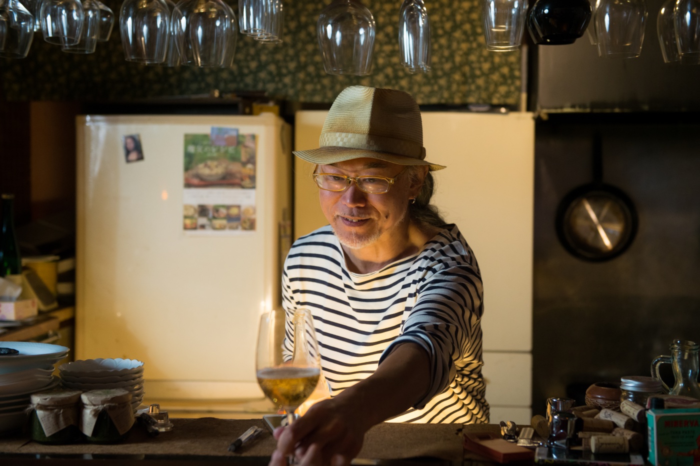 Naramoto-san’s trademark is the fedora he wears every day. In addition to wine he as a wealth of hobbies and would be happy to talk to you about bicycles, cars, furniture, music, and just about anything else until the sun comes up. Take a seat on one of the wine-red Herman Miller Eames chairs and let time slip away with a glass of good wine.