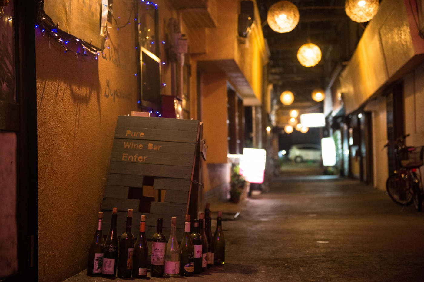 Round lights made of bamboo float in a row like planets, lighting up a nostalgic shopping arcade at night. From Takegawara Onsen, walk along Nagarekawa Street and enter a narrow street to find a little store loved by local wine drinkers. In front of the bar are many empty wine bottles, and a sign with the name written on it, “Enfer”.
