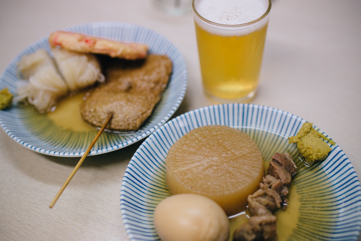 I eyed the menu written on the wall through the steam that rose from the oden, and ordered the daikon, egg, and beef sinew.