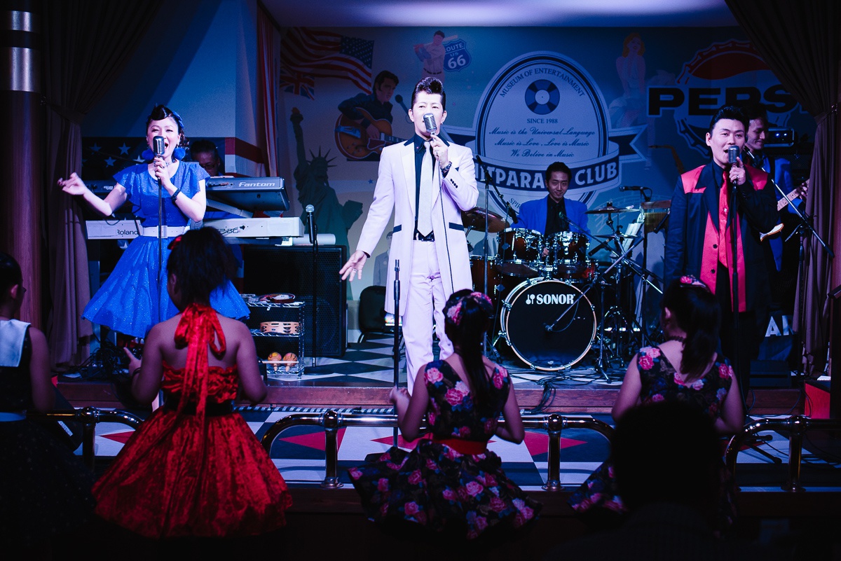 Hit Parade Club changed from being to cabaret to a live house featuring performances of oldies songs in 1988. The previous owner, after seeing women having a great time at a club in Okinawa, decided he wanted for there to be a place in Beppu where women can have fun and feel safe. That desire is what led a later owner to begin running the club as a live music venue. As Hit Parade Club, the club band Hit Paraders perform famous oldies songs from the 1950s and 60s on the club’s beautiful stage.